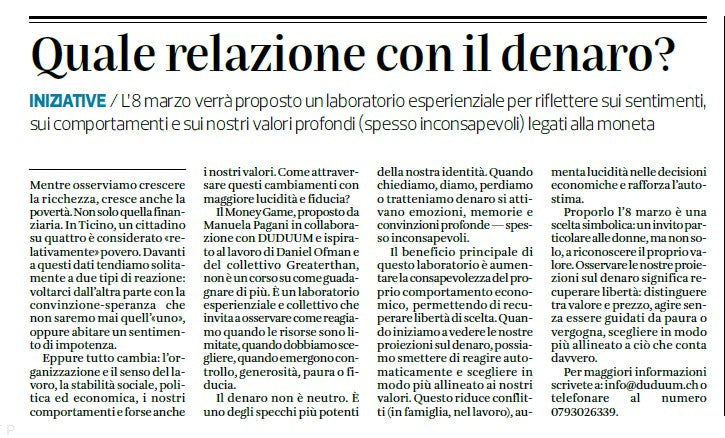 Dieser Workshop liegt uns sehr am Herzen, da das Thema Geld unserer Meinung nach für die gemeinsame Schaffung einer friedlichen Welt von zentraler Bedeutung ist. Die intensive und tiefgreifende Erfahrung hat die Gruppe begeistert und uns bewegt. Er wird ein roter Faden unserer Arbeit zur Förderung des Bewusstseins sein.